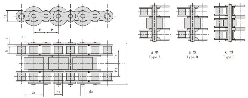 鏈號 節(jié)距 滾子直徑 內節(jié)內寬 銷軸直徑 銷軸長度 鏈板尺寸 排距 抗拉強度 平均抗拉強度 型號